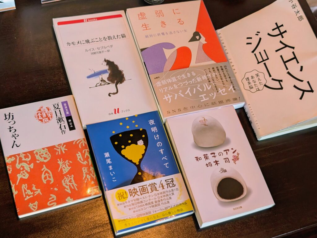 次に読む本をどのように探すのかが話題になりました。本屋大賞の作品、芥川賞直木賞の候補作、それからSNSで話題の本。ときには本屋さんで装幀買いをすることもある。読書会で紹介された本を読むという意見もありました。もともとSNSが発信の「虚弱に生きる」(絶対に終電を逃さない女)が今回の読書会で紹介されたことで、SNSをあまり使わない参加者もその内容を知ることができました。参加者の何人かは、次の本を「虚弱に生きる」するかもしれません。これも読書会の良いところだなと思いました。
