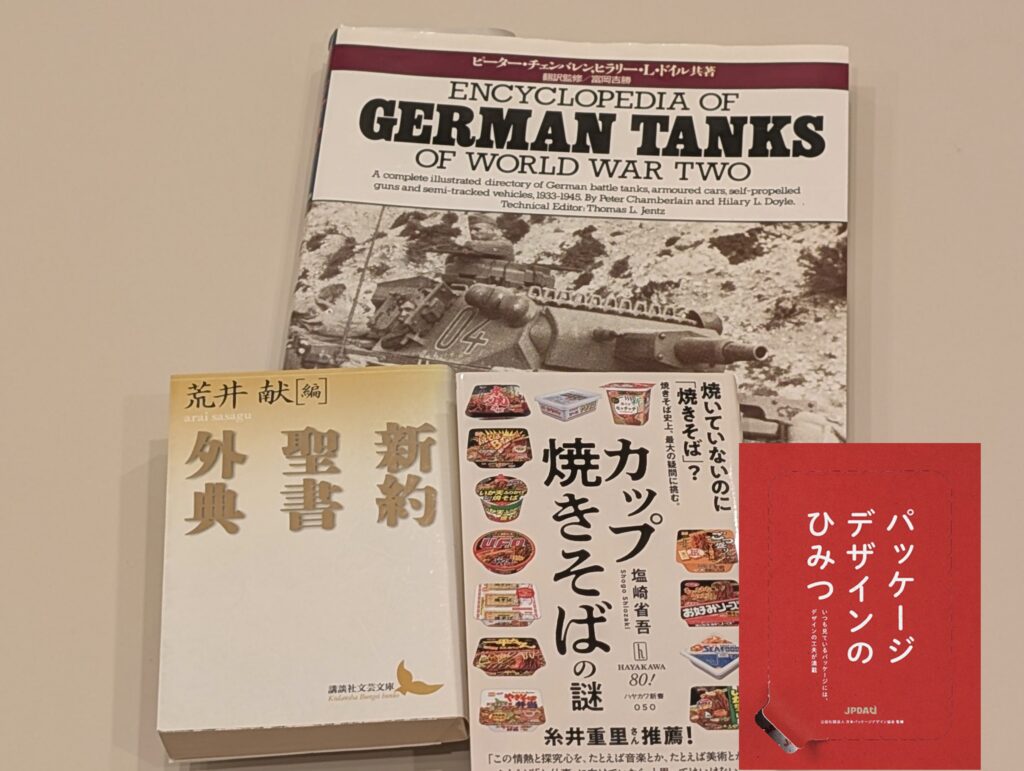 今回のテーマは「雑学」。まったくジャンルがことなる4冊が紹介されました。「カップ焼きそばの謎」はカップ焼きそばの歴史や統計の紹介。梱包と運送の効率から四角いペヤングが売れたのだとか。「パッケージデザインのひみつ」は日本パッケージデザイン協会の監修で、蓋につかないヨーグルトのパッケージのことや、おにぎりのパッケージなど、さまざまなパッケージデザインの工夫が紹介されました。「ジャーマンタンクス」では、ドイツ戦車の蘊蓄について、そこから、プラモデルの懐しい話で盛り上りました。「新約聖書外典」は新約聖書の正典から外れてしまった聖書。それでも興味深い物語がたくさん残っており、芸術作品のテーマになることもあったというお話。「雑学」いいですね。またやりましょう!